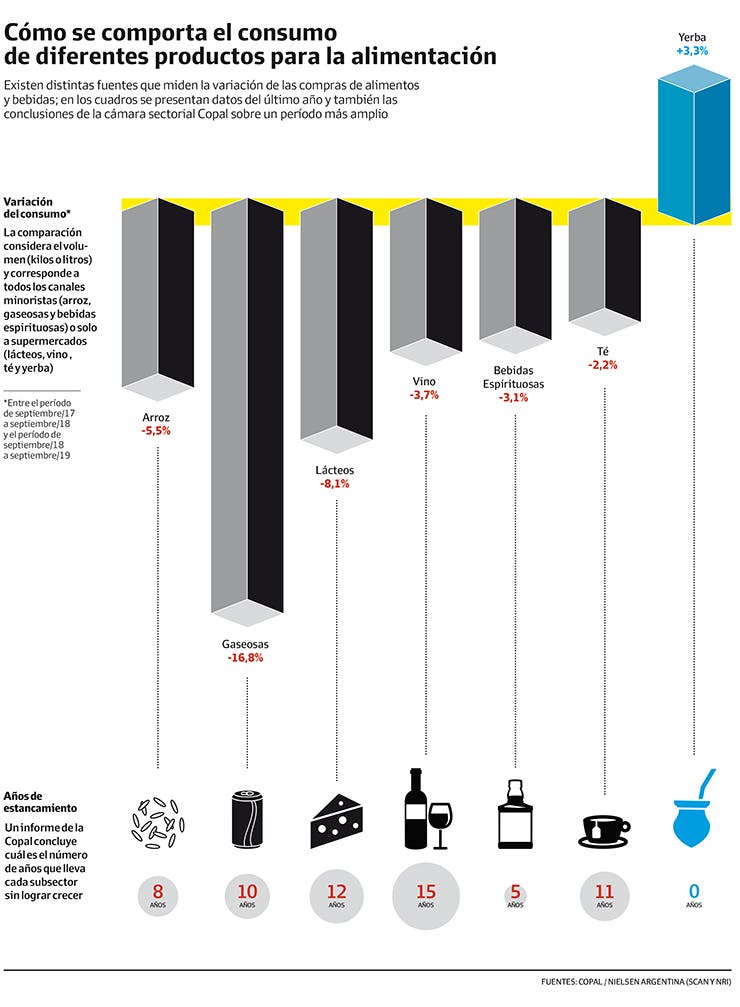 En ese film imaginario, el vino exhibe 15 años de estancamiento. Le siguen los lácteos (12 años), la harina de trigo (también 12), la carne bovina (12), el té (11), las gaseosas (10), el arroz (8) y los aceites vegetales (8), según un análisis elaborado por la Coordinadora de las Industrias de Productos Alimenticios (Copal). En tanto, entre los sectores que muestran una situación menos grave están la pesca, con un solo año de estancamiento; la carne aviar, con 3, y las bebidas espirituosas, con 5.